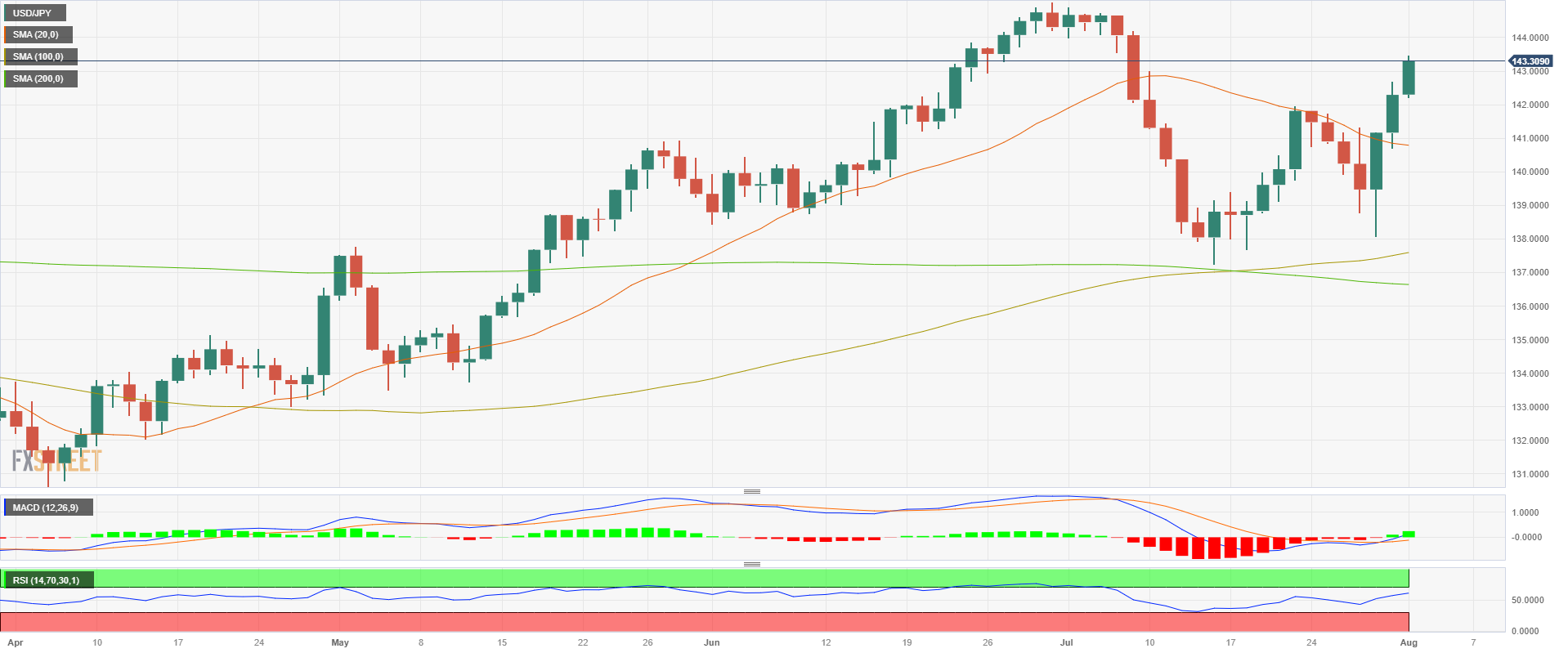 美国数据公布后,美元/日元跳涨至 143.00 上方