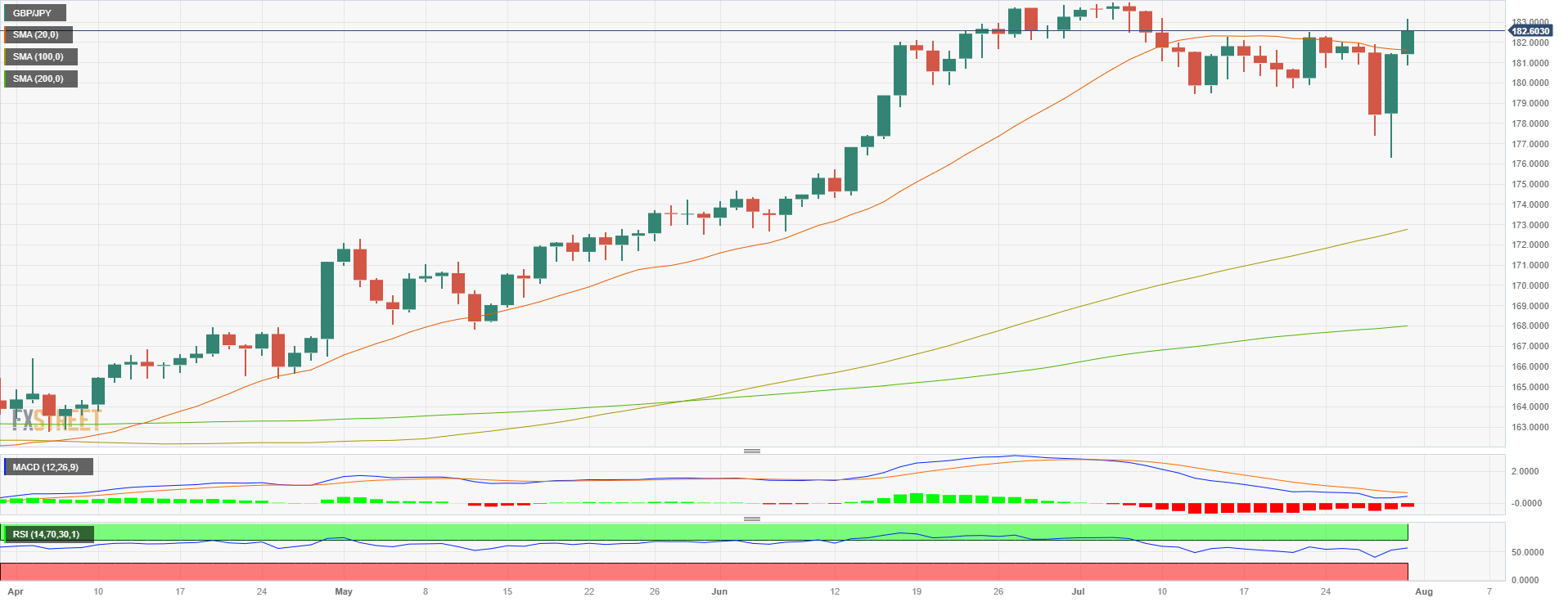 七月最后一日,英镑/日元上涨,报 182.759,日涨幅为 0.81%,这主要是由于日本央行(BoJ)周五决议上日本央行维持鸽派倾向打压日元。 在周五的日本央行决议中,日本央行意外宣布对收益率控制政