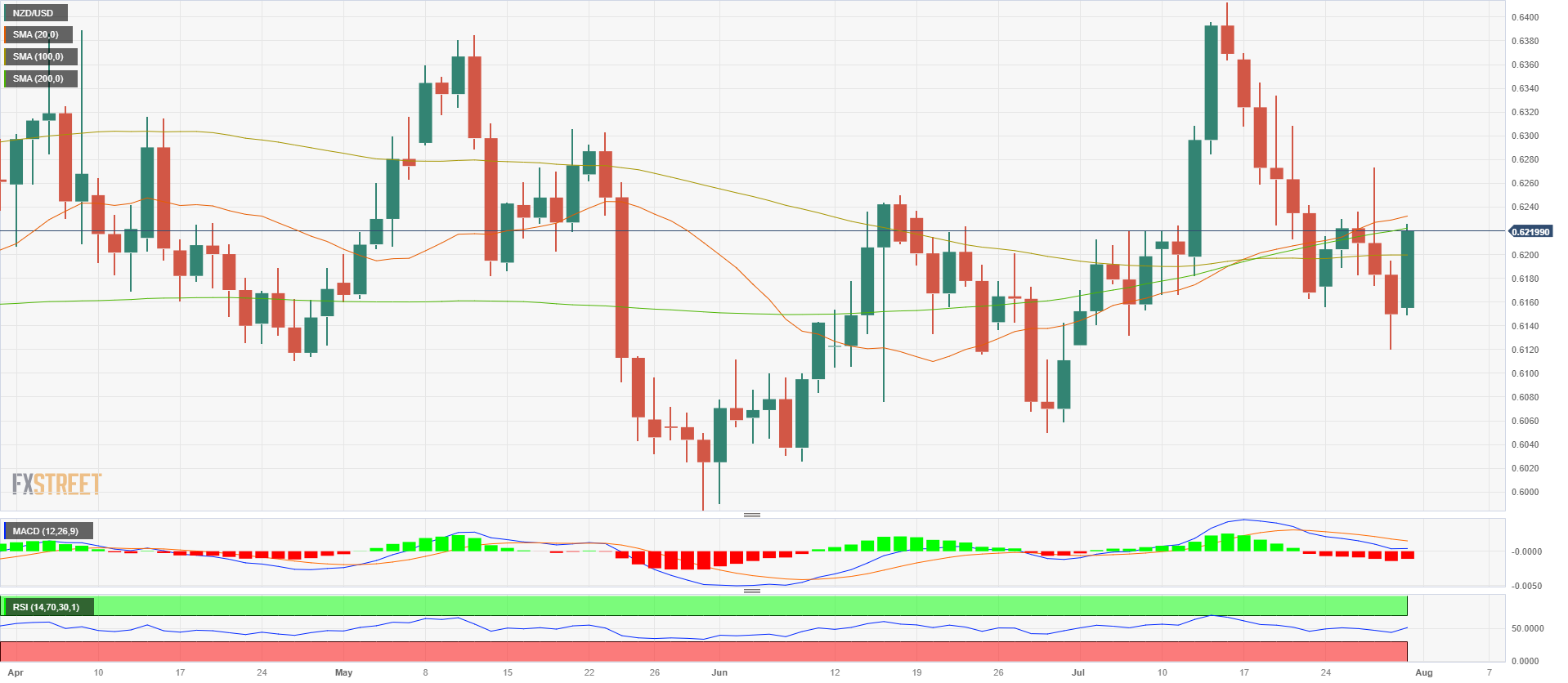 周一,纽元/美元在连续三日下跌后大幅走高,一举突破 0.6200 关口。然而,多头需要收复 200 日简单移动平均线 0.6222 才能继续走高。 美国公布了次要的经济数据。美国 7 月芝加哥制造业