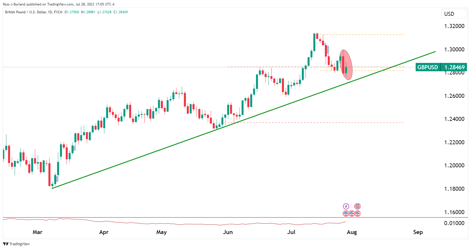 英镑/美元上周五收于 1.2840 附近,触及 7 月 6 日以来的最低水平,投资者仍担心在美国公布强于预期的第二季度国内生产总值数据后,鹰派将继续在美联储上空盘旋。 与此同时,英国采购经理人指数数