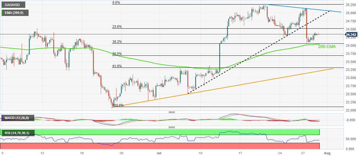 银价收窄周线跌幅,同时走高突破 24.00 美元支撑汇合点,周一亚洲时段早盘温和上涨至 24.35 美元附近。 继过去两周连续下跌后,银价延续了前日从 200 指数移动均线和 银价 6 月下旬至 7