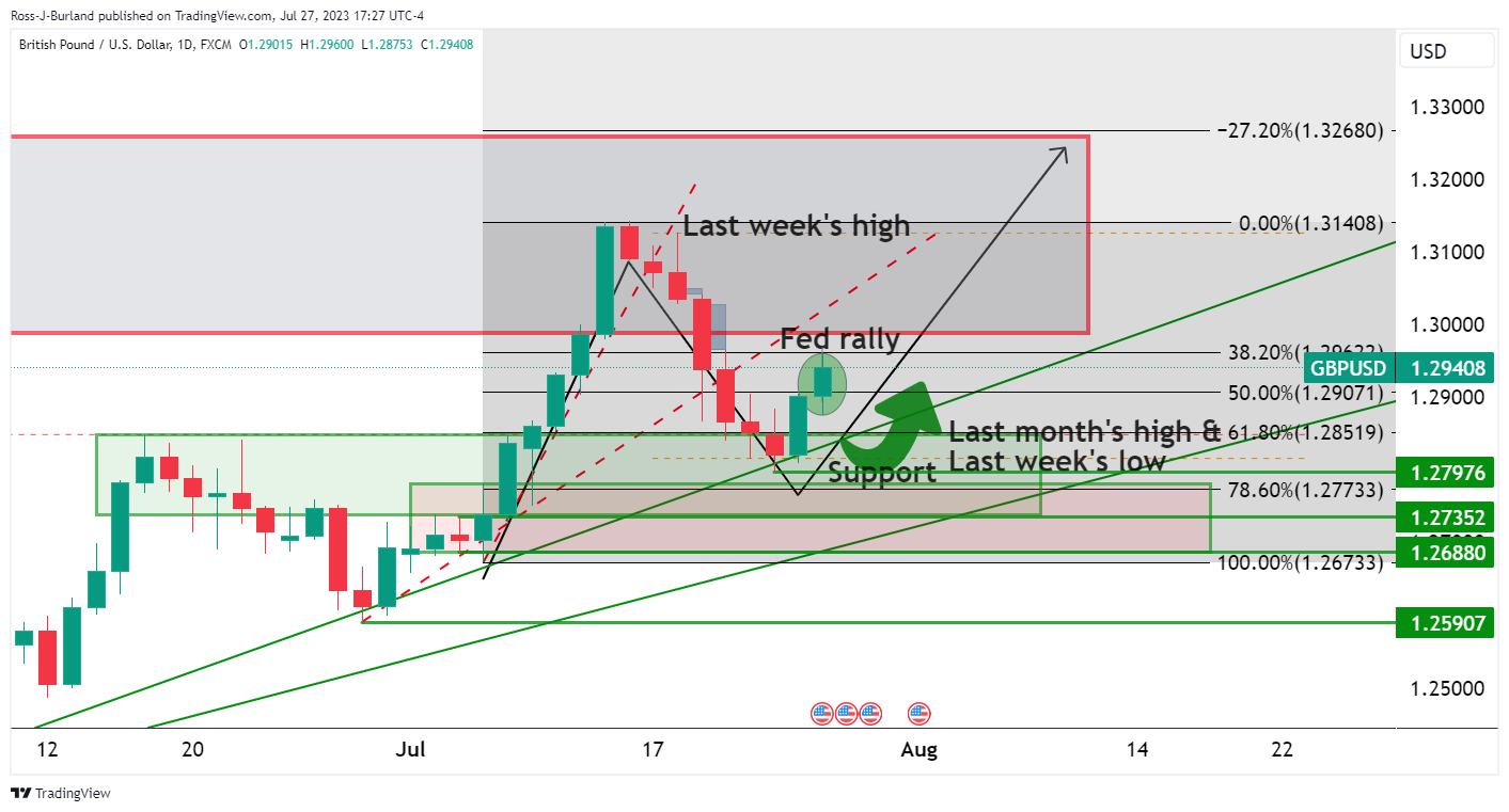 继强劲的美国数据和欧洲央行鸽派加息 25 个基点后,英镑/美元跟随欧元/美元走低。英镑/美元从 1.2995 跌至低位 1.2781,同时市场降低了对英国央行 8 月 3 日利率会议的鹰派利率预期。如