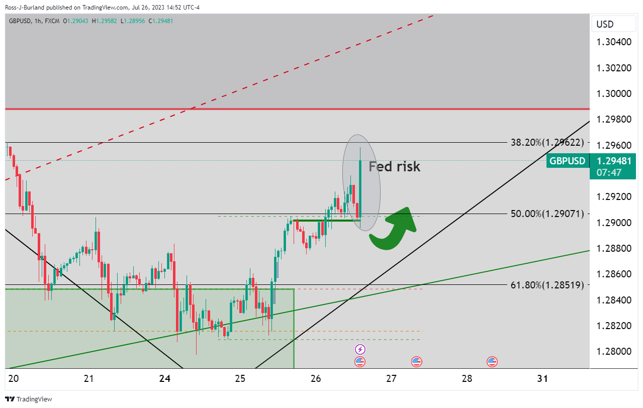 英镑/美元飙升突破了日内前期高点,并在技术保持了看涨方向,如下图所示。同时,英镑/美元日内交投于 1.2875 和 1.2958 之间,但在美联储利率决议后,1.2895 和 1.2985 是迄今为止