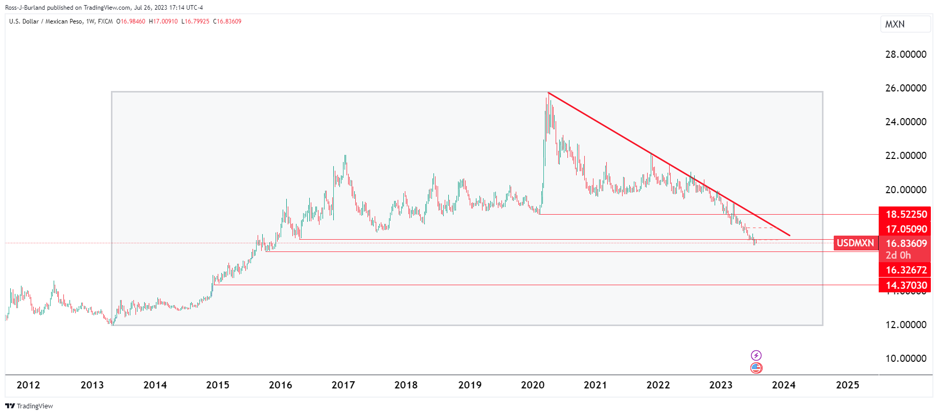 美元/墨西哥比索寻求跌破关键日线支撑位