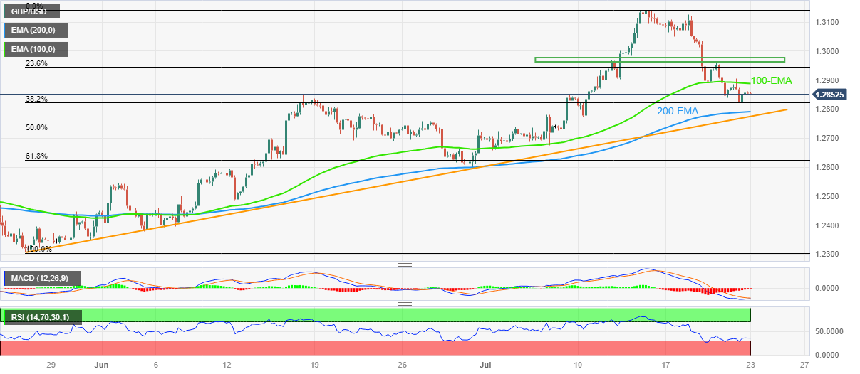 周一亚市早盘英镑/美元受到重挫后,仍在 1.2850 附近舔舐伤口。英镑/美元在 100 和 200 指数移动平均线 (EMA) 之间摇摆不定,因为在关键的英国和美国 7 月采购经理人指数初值公布之前