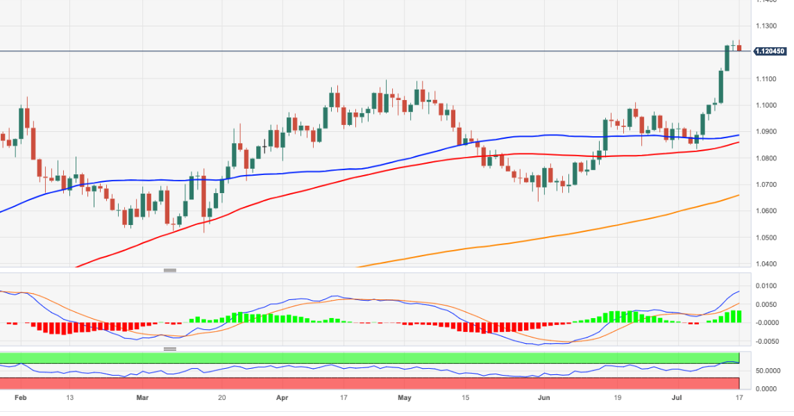 欧元/美元承压,周一考验1.1200区域。 虽然短期内似乎倾向于延续上行势头,但货币对当前的超买状况可能引发膝跳式修正。在2023年顶部1.1248(7月17日)上方,该货币对有望遇到下一个阻力位,