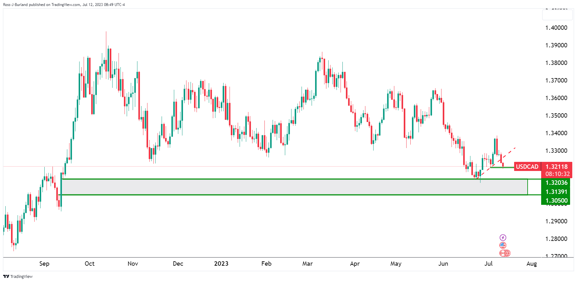在加央行利率决议前,美元/加元因疲软的美国CPI而承压。 美元/加元空头正在施压多头回测1.3200支撑位下方。 在美国6月消费者物价指数(年率)大幅偏离,为3.0%(预期3.1%,前值