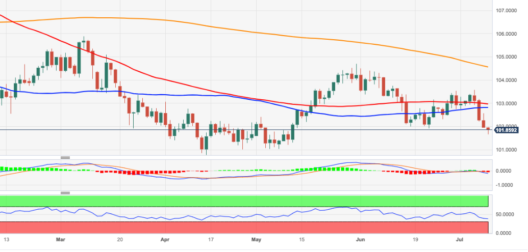 DXY周二延续多日跌势,跌至101.70/65区间。 从目前的价格走势来看,美元在6月高点103.54(6月30日)下方面临进一步抛售压力。尽管如此,7月低点101.66(7月11日)被击穿后,5月