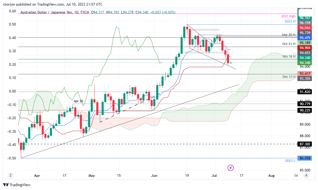 澳元/日元继空头走强,跌穿95.18附近的技术支撑位后,在94.90处击穿前者,扩大跌破基准线以下的跌幅。澳元/日元滑落至四周新低94.11,之后在企稳于现价附近。发稿时澳元/日元在亚洲时段开盘交投于