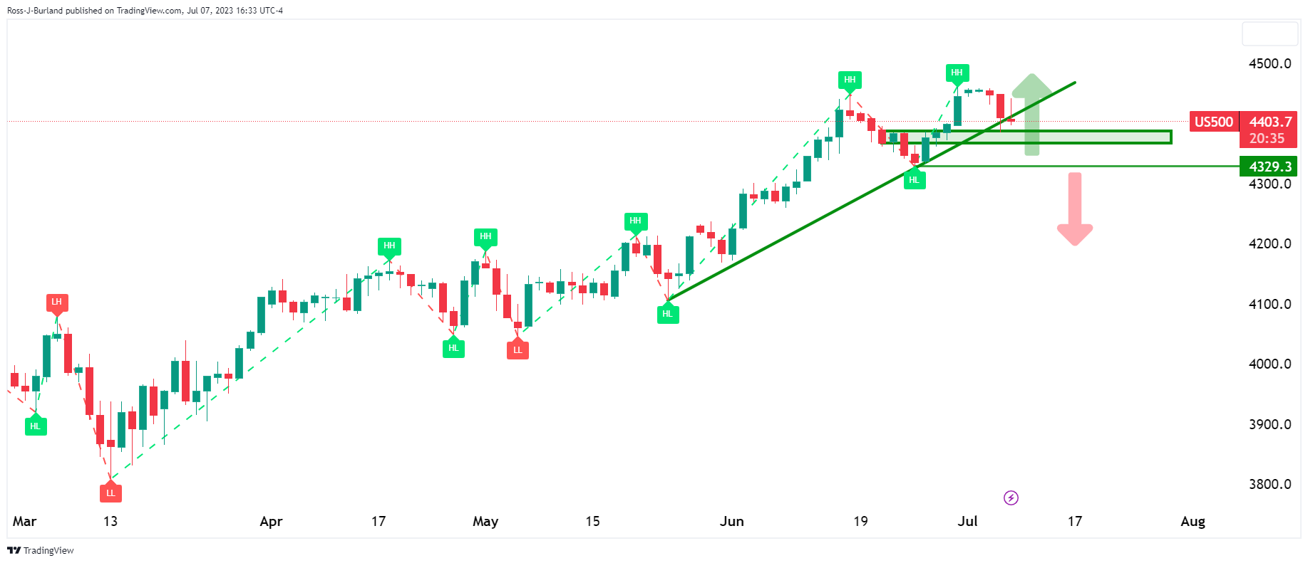标普500指数上周五下跌,收盘弱势加剧。劳工部公布美国非农就业数据使得美国就业市场信号含混不清,这对当天晚些时候的市场情绪产生了影响。 发稿时,标普500指数收盘下跌了约0.15%,从高位4,441.