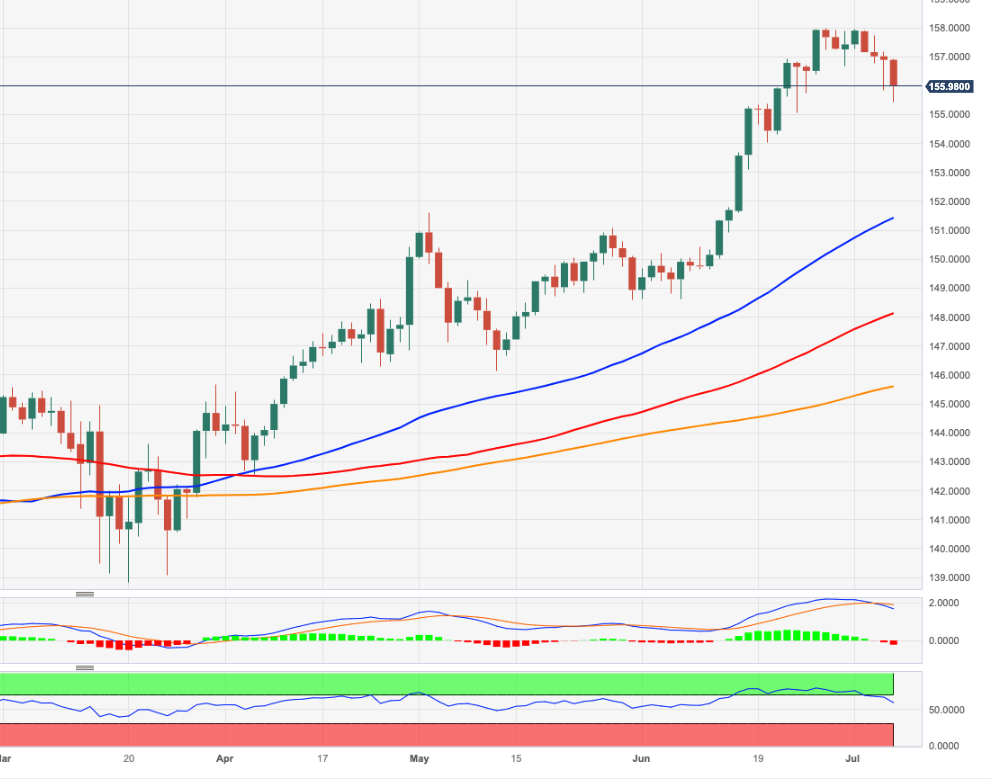 欧元/日元扩大了正在进行的周线下跌,并在本周末重访155.50区域。 该交叉盘加速下跌,并脱离超买区域,同时在周五重访了155.50区域。在此背景下,短期内回调的延续似乎是可能的,下一个支撑位于15