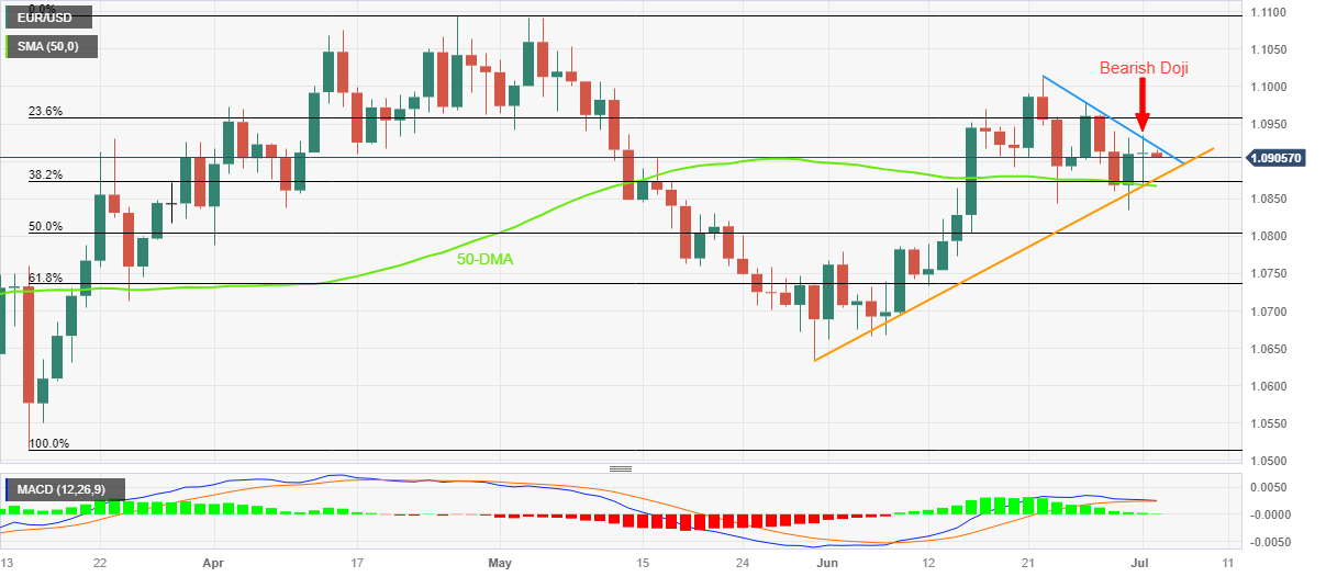 欧元/美元价格分析:因周一的十字星和MACD信号看跌,欧元下跌至1.0900
