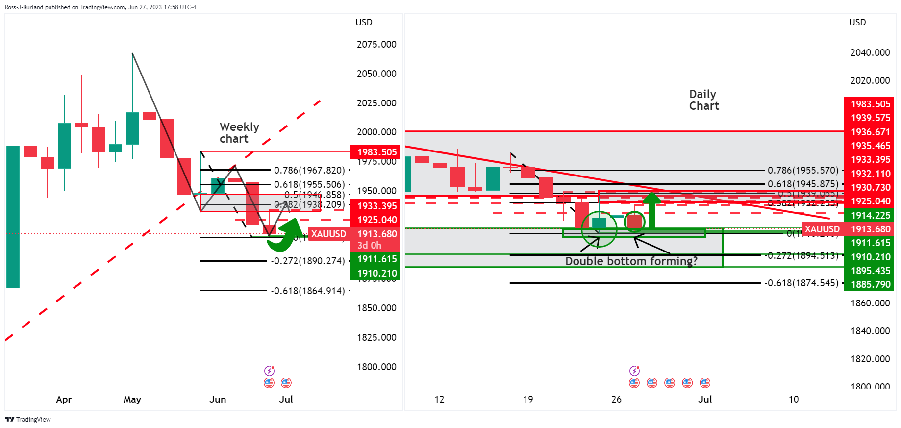 周二黄金价格下跌,中断周初1933美元和1910美元整数关之间的平衡。金价从1,930.73美元的高点跌至1,910.89美元的低点。基本上,后市几天关键事件发生之前,继周一窄幅波动后出现下跌。 5