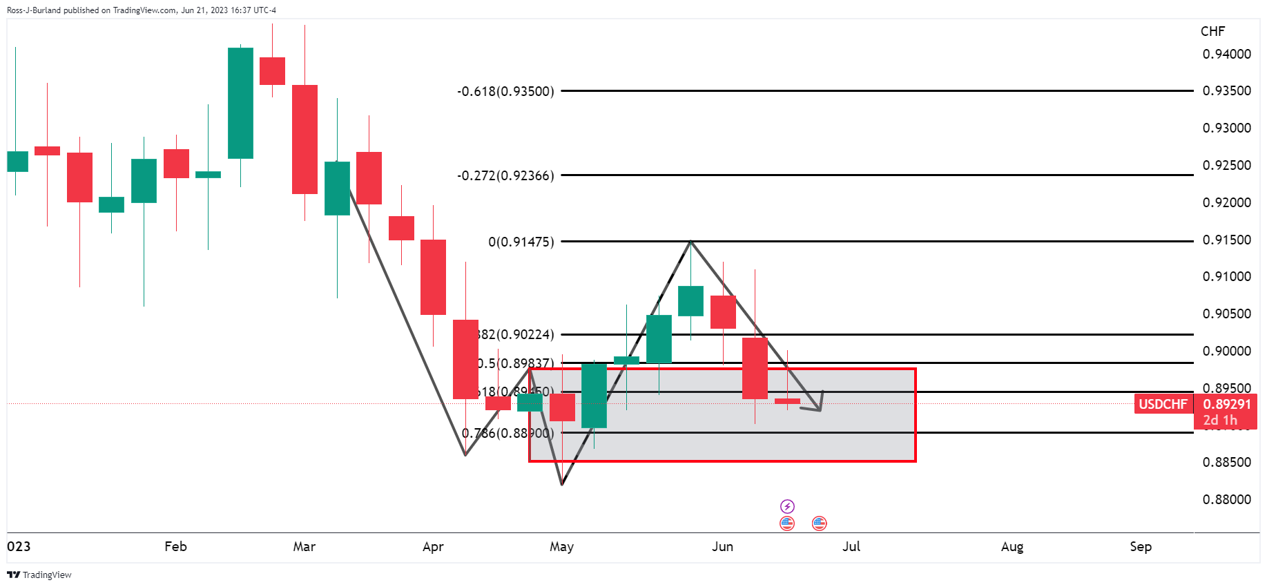 周三美联储主席鲍威尔表示央行降低通胀的斗争“任重道远”之后,美元跌去涨幅。 这让瑞郎出现强劲的买盘,并有望进一步下跌,以下技术图型将对此说明: 美元/瑞郎周线图 周线图显示,到目前为止,价格已