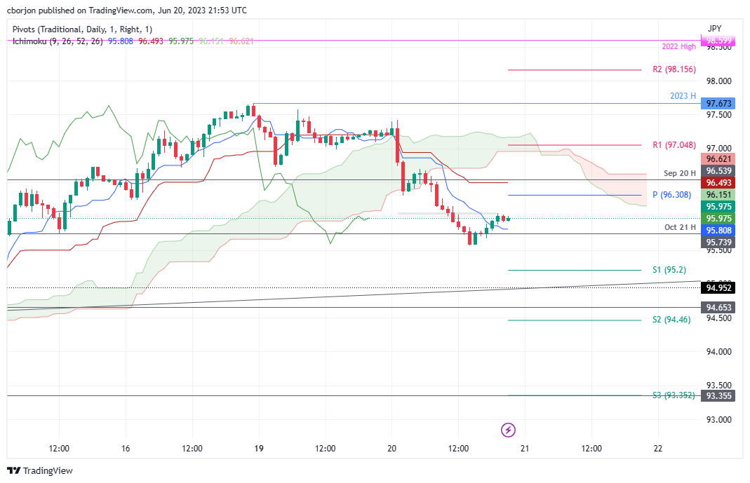 亚市开盘,澳元/日元交投于95.96附近,跟随周二的价格走势。澳元/日元构筑黄昏之星三K线形态,这表明预计澳元/日元将展开进一步下跌。 澳元/日元价格分析:技术面展望 日线图显示,澳元/日元在中期内