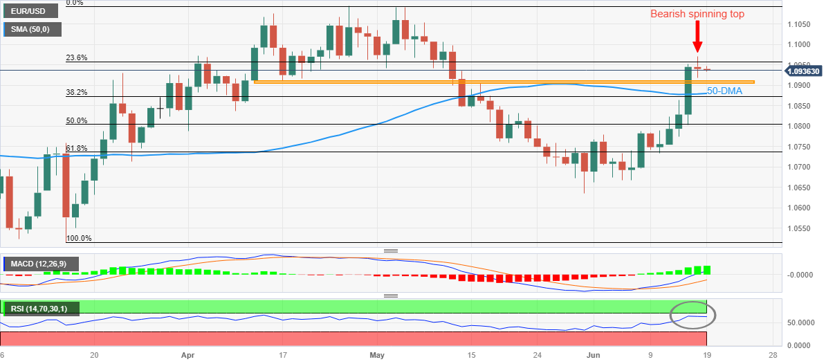 欧元/美元价格分析:处在看跌纺锤K线顶部且相对强弱指标超买,空头指向1.0900