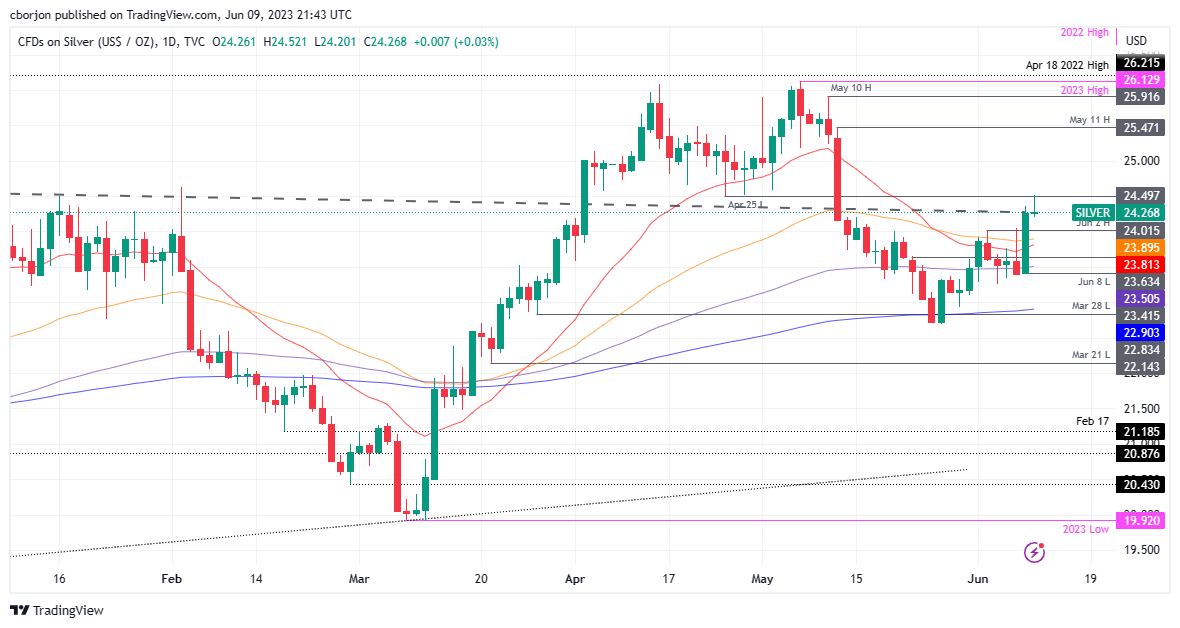 银价触及四周新高,但当日收盘自该水平回撤,构筑墓碑式的十字星,表明买家和卖家都没有赢得这场战斗,这将持续到本周。因此,银价刷新日线高位24.52美元后,上周收盘于24.26美元附近。 银价价格分析: