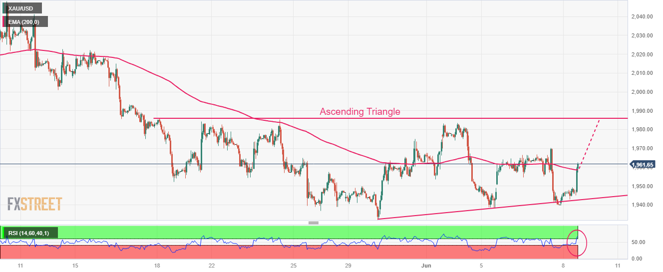 金价(XAU/USD)在高于预期的美国周度初请失业金数据公布后出现了大幅上涨。贵金属已经跳升至1,960.00美元附近,因为美国劳工部报告称,截至6月02日当周的初请失业金人数大幅增加了2.8万,达到