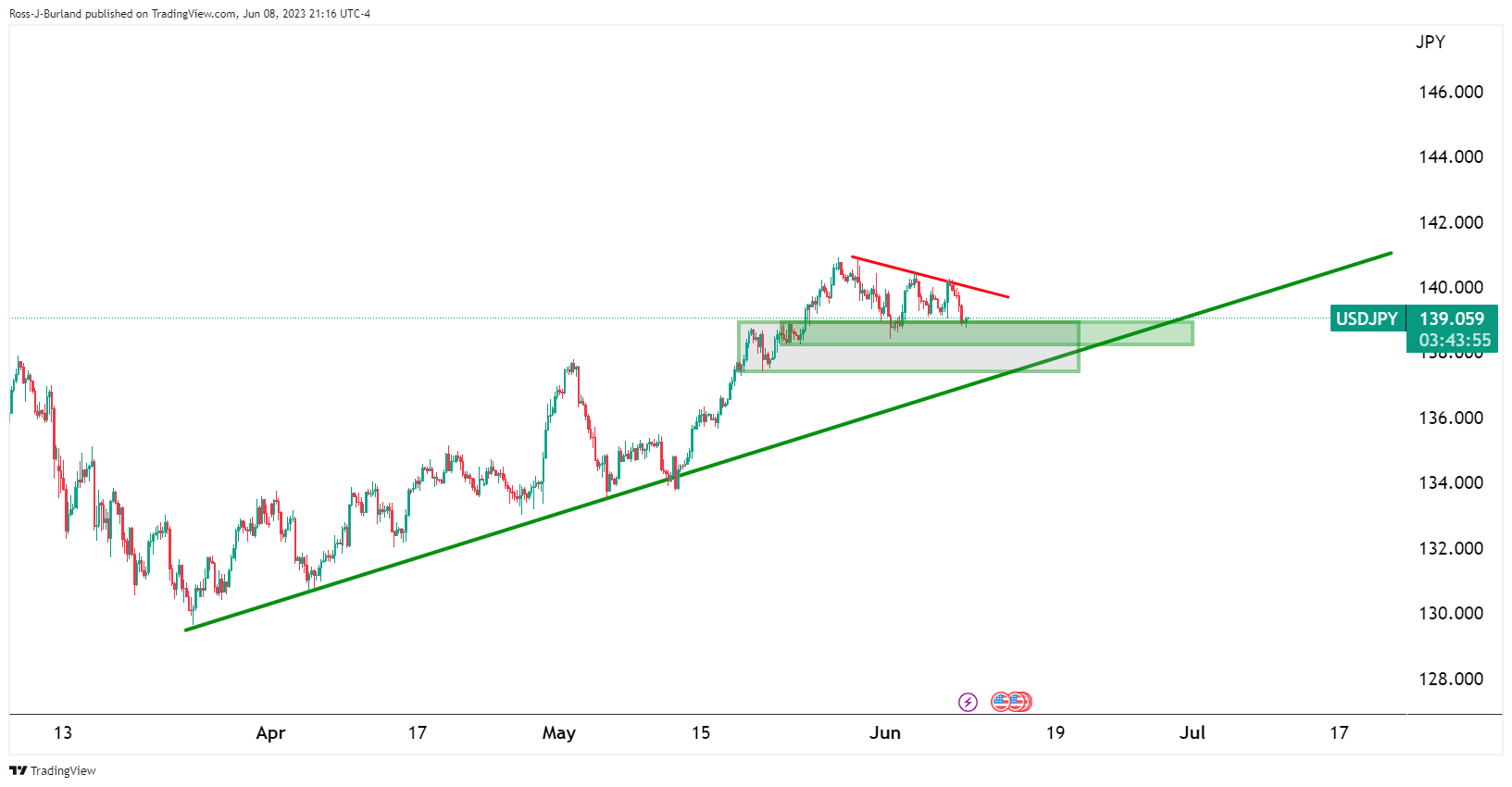 欧元/日元已经在支撑位和阻力位区间徘徊了很多天,并紧紧维持在趋势线支撑上方。日元和欧元都受益于美元走软,因为长期以来有利于美元的央行政策分歧正减弱。周四数据是向市场发出美联储即将暂停加息周期信号的最新