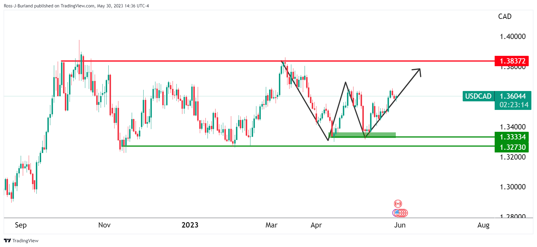 周一加元兑美元走高,原因是美国债务上限协议暂时搁置提振投资者情绪。然而,从技术面来看,强劲的多头可能会突破美元/加元整理形态,下面将说明这一点。 美元/加元日线图 美元/加元正构筑W形态,并维