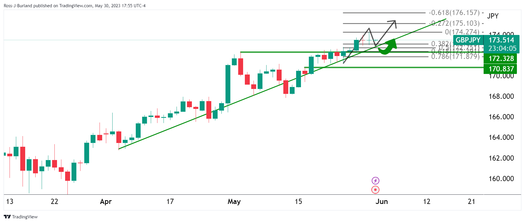英镑/日元正测试看涨周期新高174.00附近测试,但这可能是见顶水平。英镑/日元正实现本周初步平衡,可能存在看跌头寸。以下将从看跌和看涨分析英镑/日元形态。 英镑/日元日线图 英镑/日元看