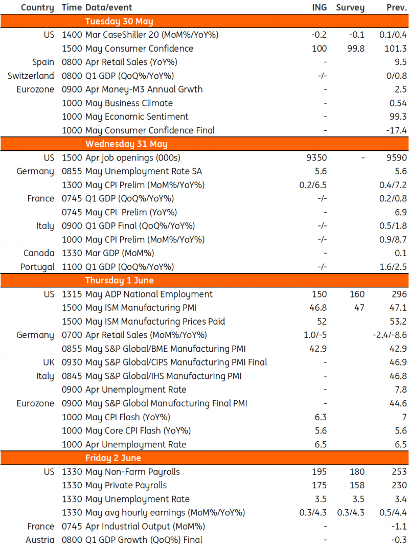 市场的焦点一直在债务上限谈判上,虽然时间不多了,但双方似乎即将达成协议。虽然风险情绪在本周结束时有所回升,但股市普遍走低,收益率走高,而美元相对周期性货币则有所上涨。从美国短期国库券曲线来看,违约担忧