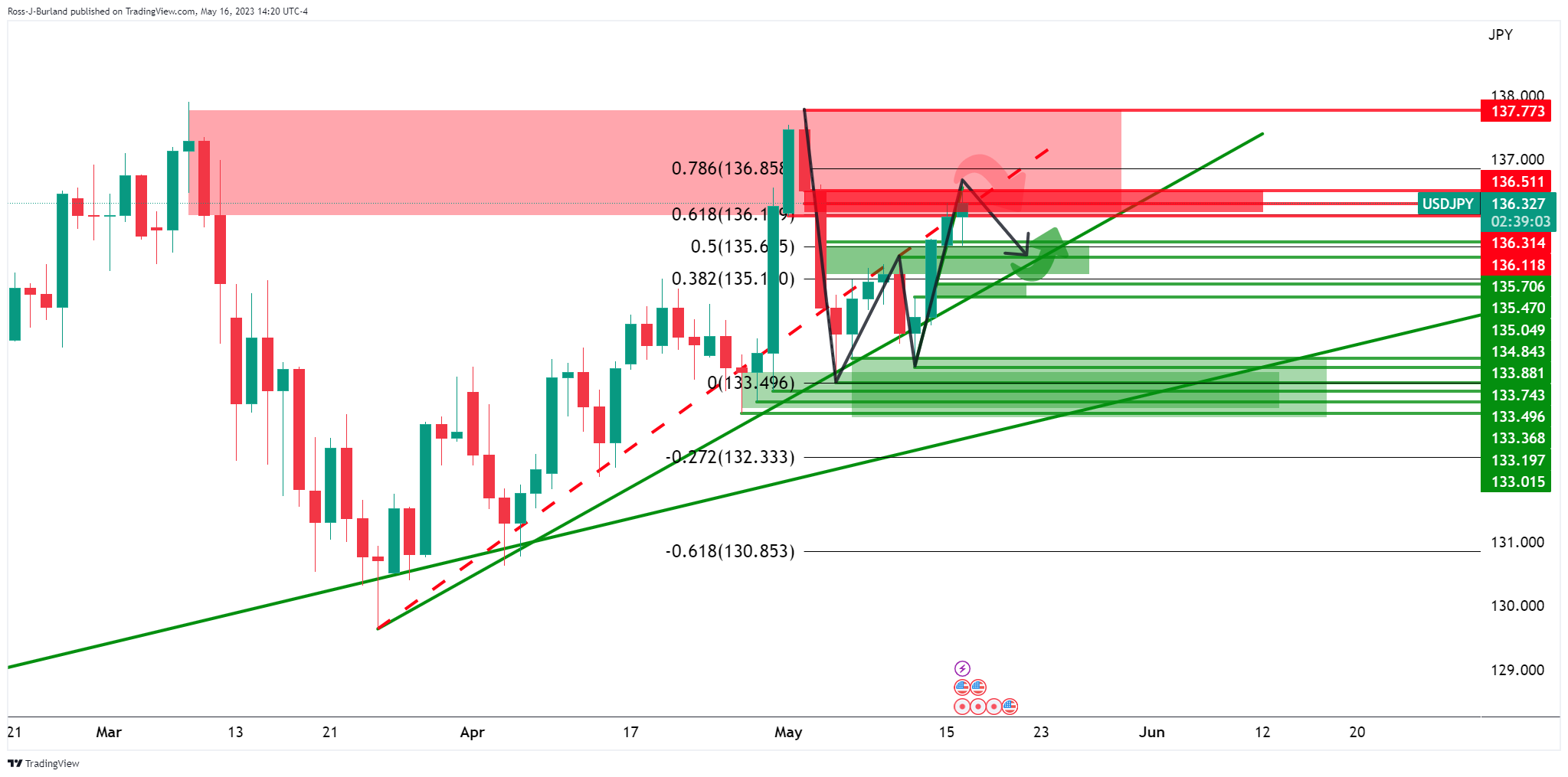 美元/日元一直以多头为主。然而,如果美元/日元跌破支撑136.20附近,可能会出现大幅下跌整理。随后将关注135.50,如以下技术图形所示。 美元/日元日线图 美元/日元处在W形态内,正接近阻