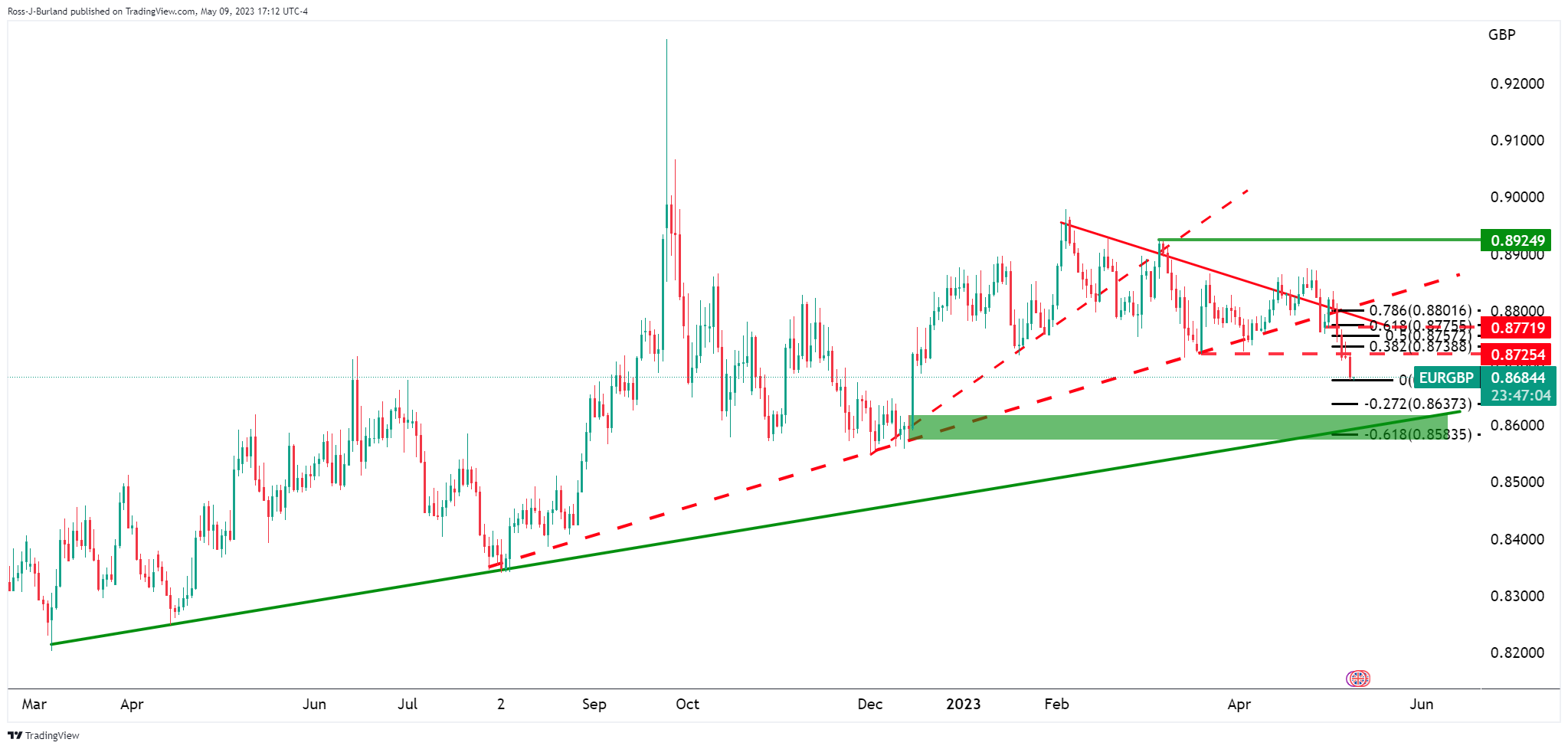欧元/英镑自由落体式跌至看跌周期中的新低。空头正接近0.8670,指向0.8650。以下说明日图和4小时图欧元/英镑的价格走势和市场形态,并提出价格减速跌至支撑的理由。在这种情况下,在进一步接近关键长
