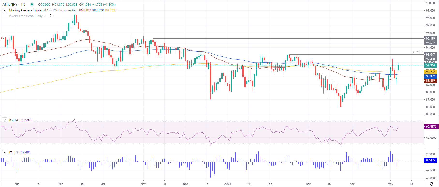 澳元/日元价格分析:持续上涨后整理于91.50附近,维持盘整