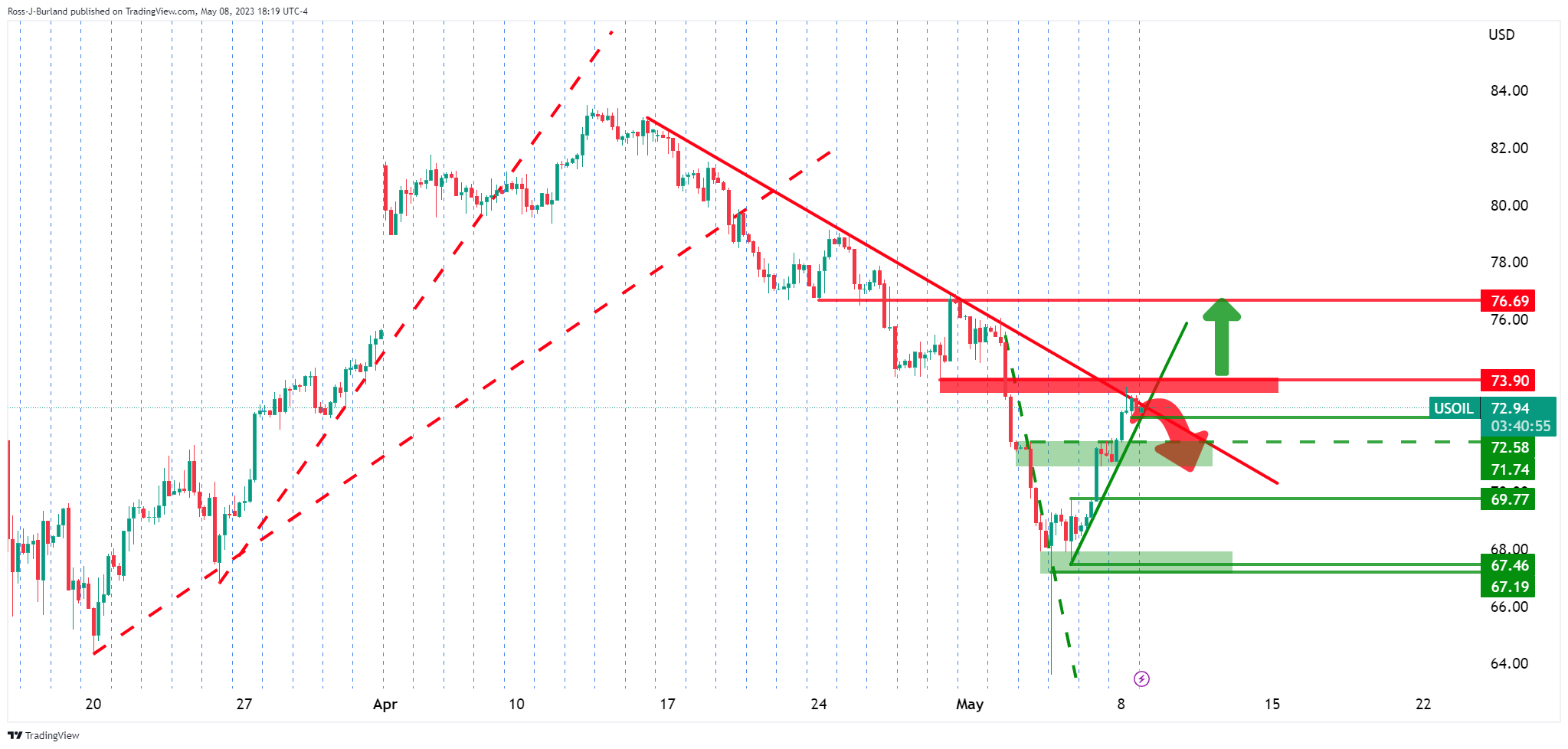 WTI油价周一连续第二个交易日收高,此前上周五公布的美国非农就业数据意外强劲。市场对经济衰退前景的忧虑正在缓解,起到提振WTI油价的作用。 以下是4小时图WTI油价技术形态: WTI油价4小时图
