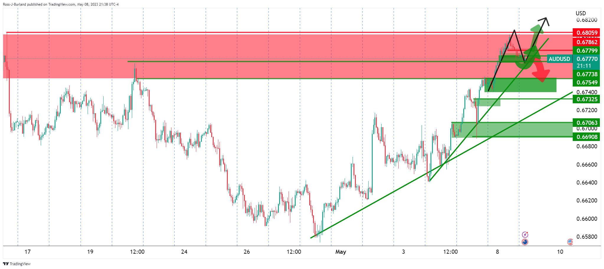 澳大利亚统计局公布的第一季度零售销售季率如下: 澳大利亚第一季度零售销售季率录得-0.6%,期值-0.4%,前值为-0.2% 澳元/美元最新波动 澳元/美元维持在支撑形态上方,小时图显