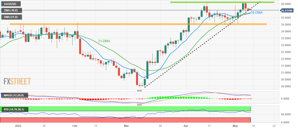 周二早盘,银价维持疲弱,处在盘中低点25.50美元附近,录得三连跌。 这样一来,银价验证下行跌破3月初以来的上行支撑线,现在的阻力25.65美元附近。MACD信号看跌且相对强度指标(14)自超买区回