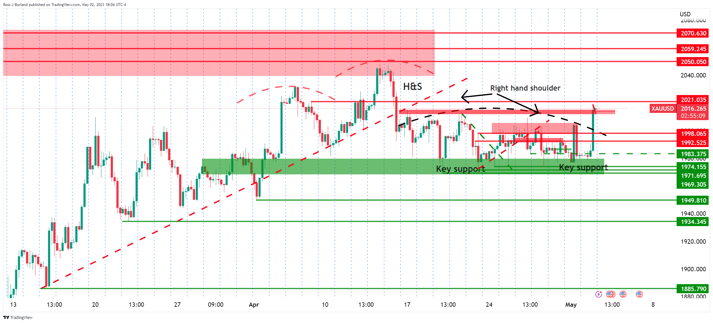 美联储决议公布之前,美国3月JOLT职位空缺不及预期,金价出现抛物线式反弹。金价突破之前的通道阻力,从低点1,978美元反弹到高点2,019美元。 美国3月JOLT职位空缺从2月份的997.4万降至