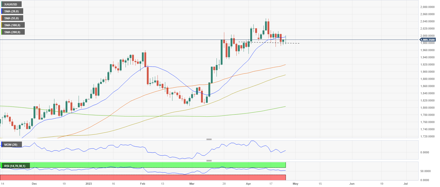金价在过去一小时大幅反弹,上涨超过10美元。黄金/美元在1,975美元探底,然后跳升至1,994美元。截至发稿时,它在1,987美元小幅下跌,走势震荡。尽管有大的波动,但价格仍然在最近熟悉的区间内。