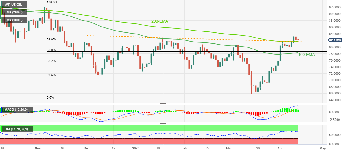 周五早盘,WTI原油维持前日自数日高点反转,发稿时承压于82.20美元附近。在这期间,WTI油价验证相对强弱指标超买信号。 在这期间,WTI油价下跌测试去年11月至3月跌势的61.8%斐波位82.0