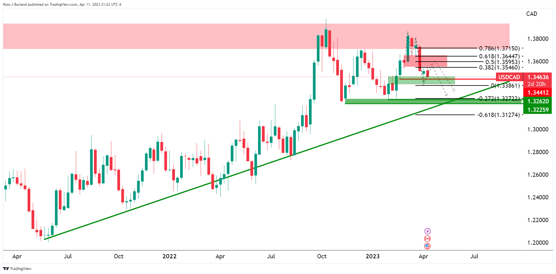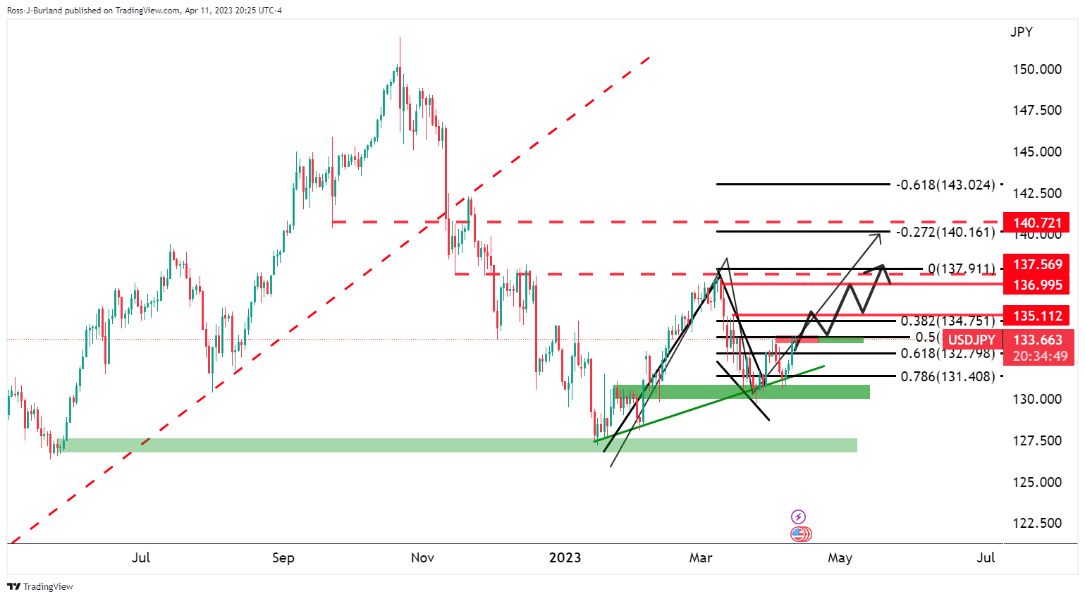 美元/日元交投于133.60,自周二东京股市收盘时的水平133.26上涨,但当天到目前为止持平。交易员们正在关注当天晚些时候将公布的美国消费者通胀数据,但按照以下自上而下的分析所示,美元/日元技术面偏
