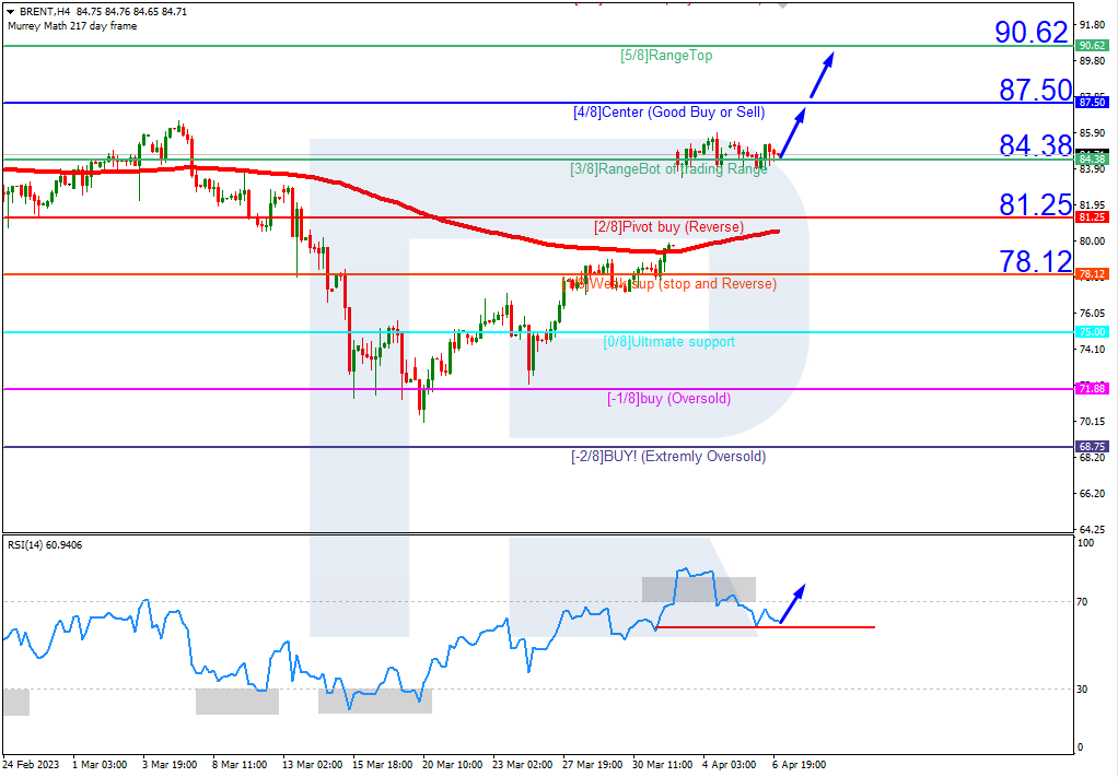 布伦特原油 在4小时图上,油价位于200日均线上方,表明处于上行趋势中。RSI逼近支撑线。油价应测试4/8 (87.50),然后上涨至5/8 (90.62)的阻力位。若跌破3/8 (84.38),该情