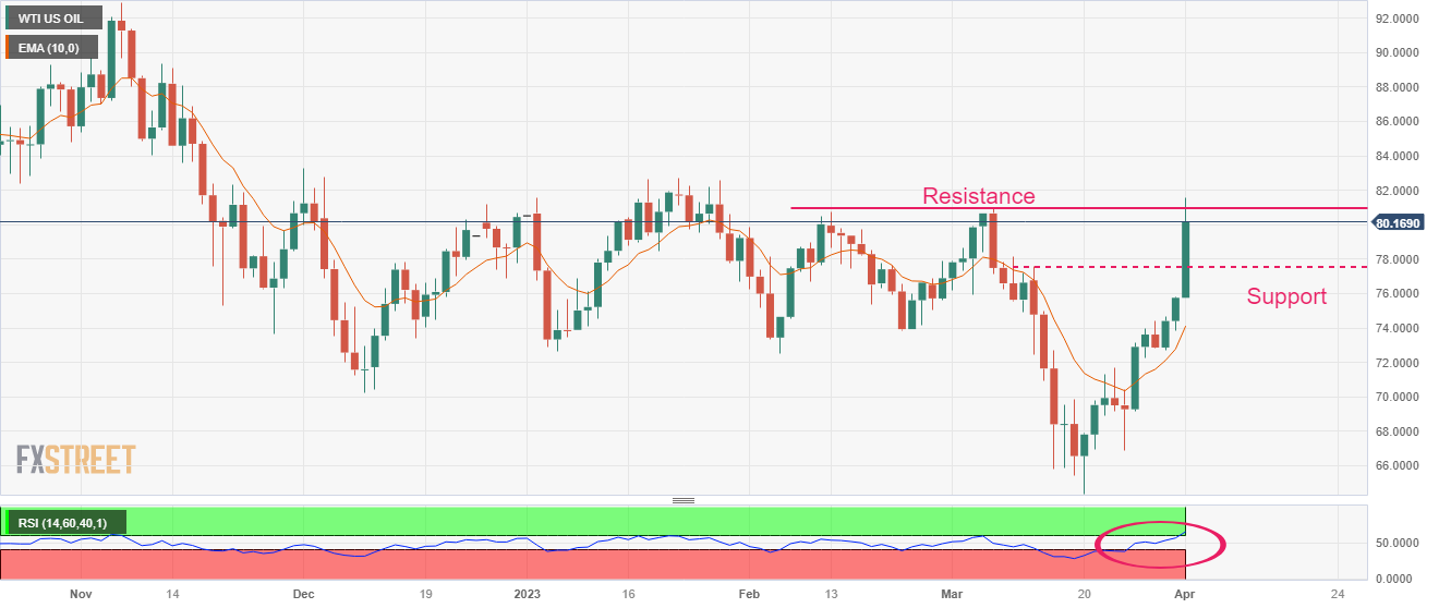 WTI油价亚市未能维持在81.00美元上方后,出现了一些整理。继欧佩克+组织宣布本周末进一步减产的激励下,油价在81.00美元上方构筑大幅跳空缺口,较上周五收盘水平上涨7%。 据路透社报道,欧佩克+