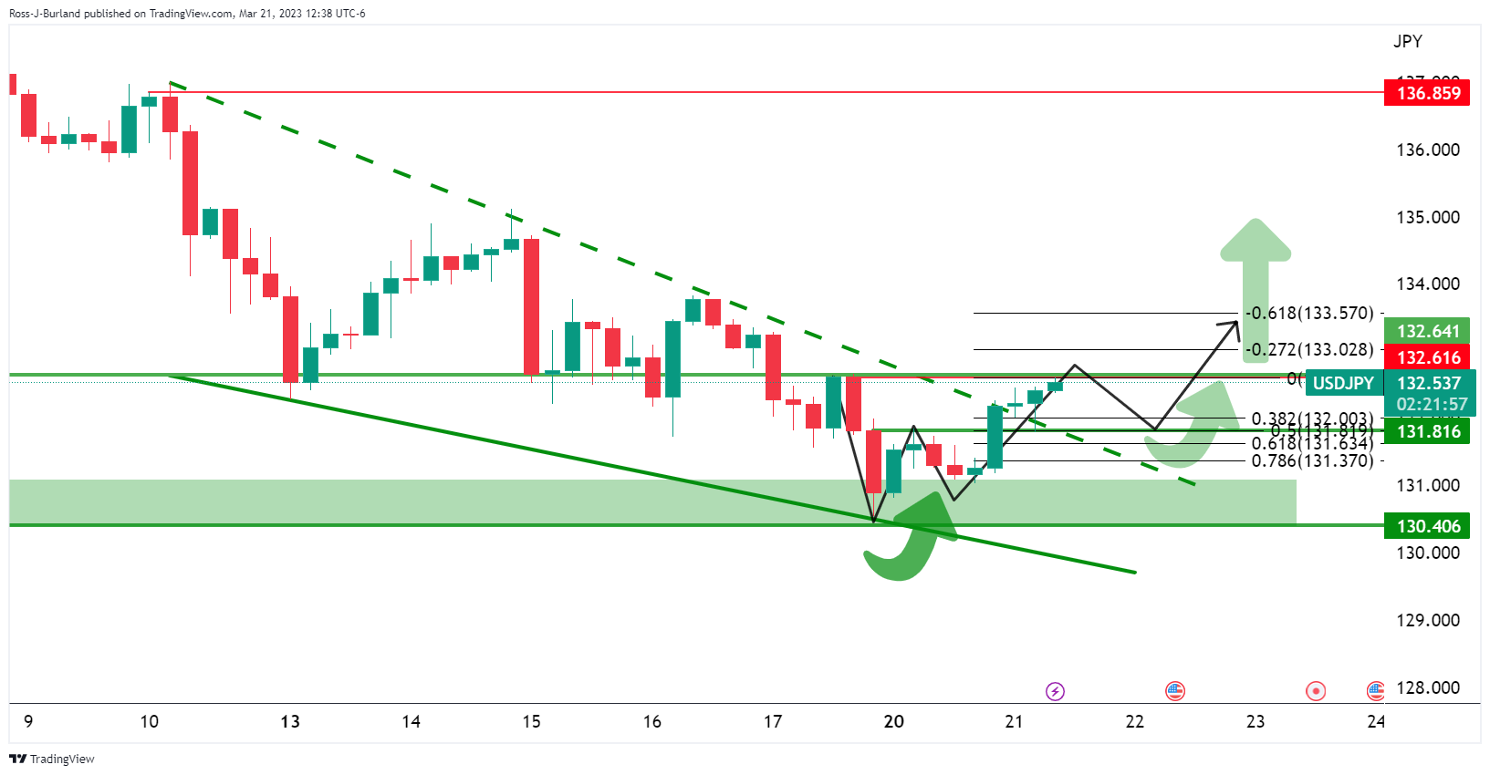 根据前期分析, 美元/日元价格分析:多头走强将测试关键阻力132.60附近,同时指向50%斐波位和支撑位,空头按照预期进入市场,汇价构筑W形态。然而,在美联储会议期间,这一走势更加明显。 美元/日元