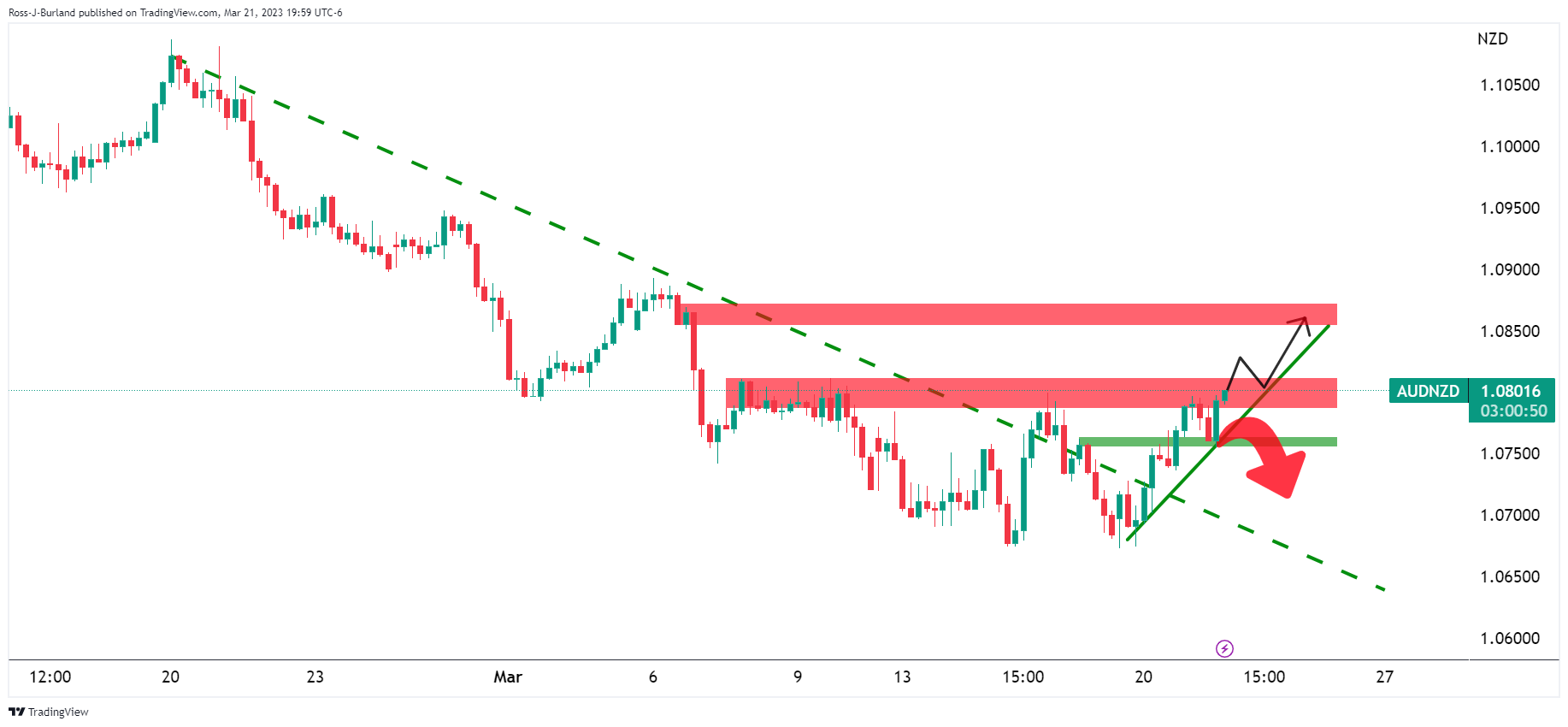 市场对全球银行体系的担忧有所缓解,美联储决议前,澳元和纽元出现上涨,澳元领涨。以下技术形态显示多头正占主导,如下所示: 澳元/纽元4小时图 澳元/美元正上涨,突破看跌趋势,处在周初构筑小型看涨