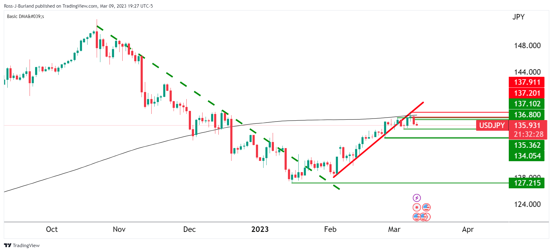 美元兑日元处于135.90,周四东京股市收盘时为136.82。今天日本央行行长黑田东彦将宣布最后一次利率决议,他的任期将于4月8日到期。 会议前美元兑日元看跌,空头突破136的水平。 美元兑日元日