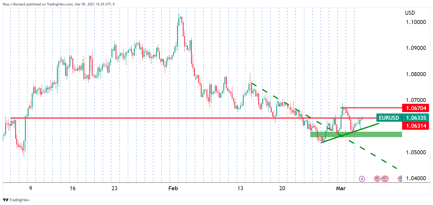 美元的卖压重现让欧元/美元加快步伐,并在周末重新收复1.0600心理关口。 欧元/美元现在关注美国数据 本周至今,在美元同样摇摆不定的表现中,欧元/美元保持着波澜不惊的价格走势,而大洋两岸的收益率