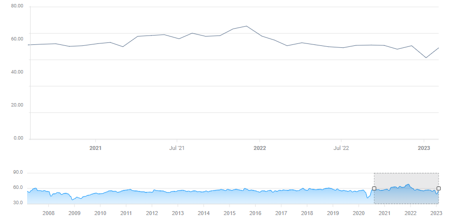 中国 二月 中国财新服务业采购经理人指数为55,高于预期50.5