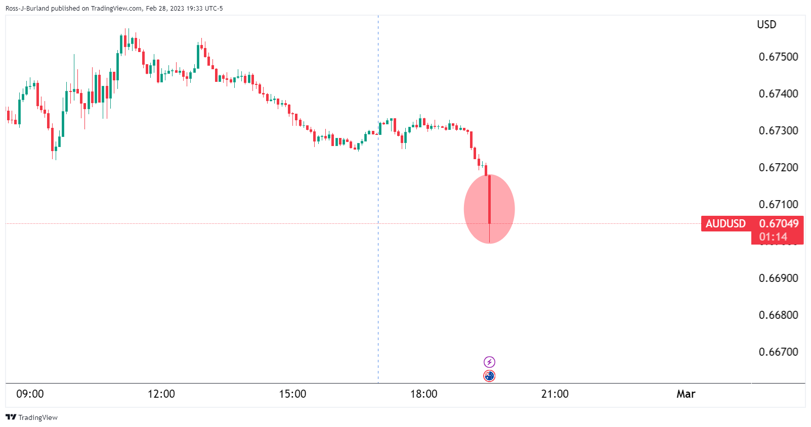 由于澳大利亚统计局公布的第四季度国内生产总值(GDP)数据好坏参半,澳元/美元大幅下滑至0.6700附近。第四季度国内生产总值为为0.5%,低于期值0.8%和前值0.6%。国内生产总值维持在2.7%,