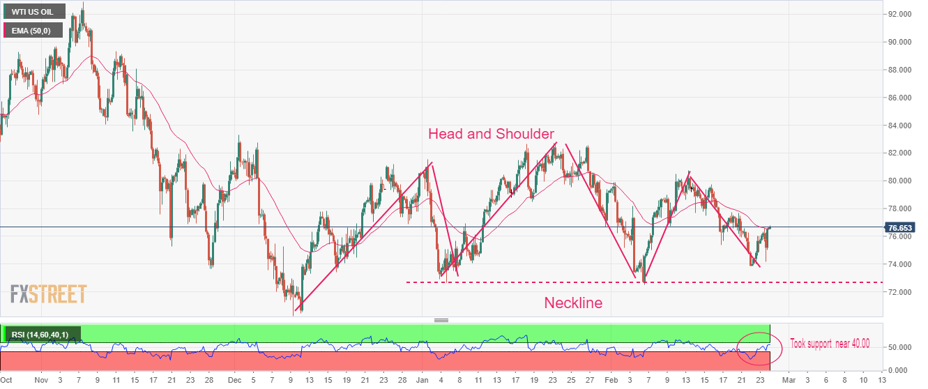 纽约商品交易所(NYMEX)西德克萨斯中质油(WTI)期货价格自74.00美元上涨至77.00美元,接近4天以来的最高水平。在美国家庭支出回升后,美联储(Fed)的鹰派押注不断上升,而油价却忽视这一点