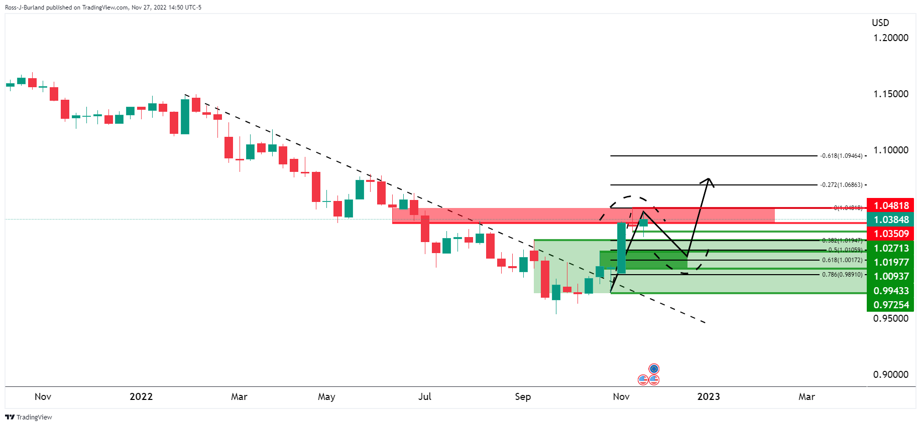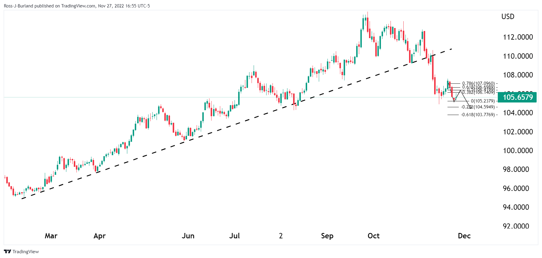然而,在美联储放缓政策紧缩步伐的前景下,美元仍接近多个月的低点。尽管如此,本周风险事件可能是中国新冠疫情,并提振美元、日元和国债等避险资产。 美元技术分析 美元处在看涨趋势的背面,美元正展开丅