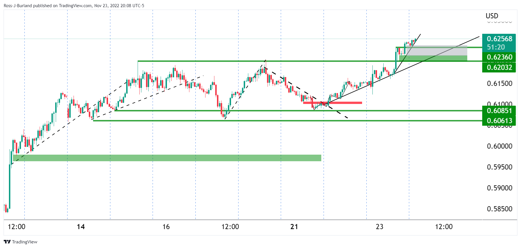 银价继触及21.67美元周线高位后回落,此前周三大幅攀升,美联储(FED)11月会议纪要公布后美元承压。另外,中国新冠疫情危机等因素也提振银价。因此银价交投于21.47美元。 周四,美国市场因纪念感