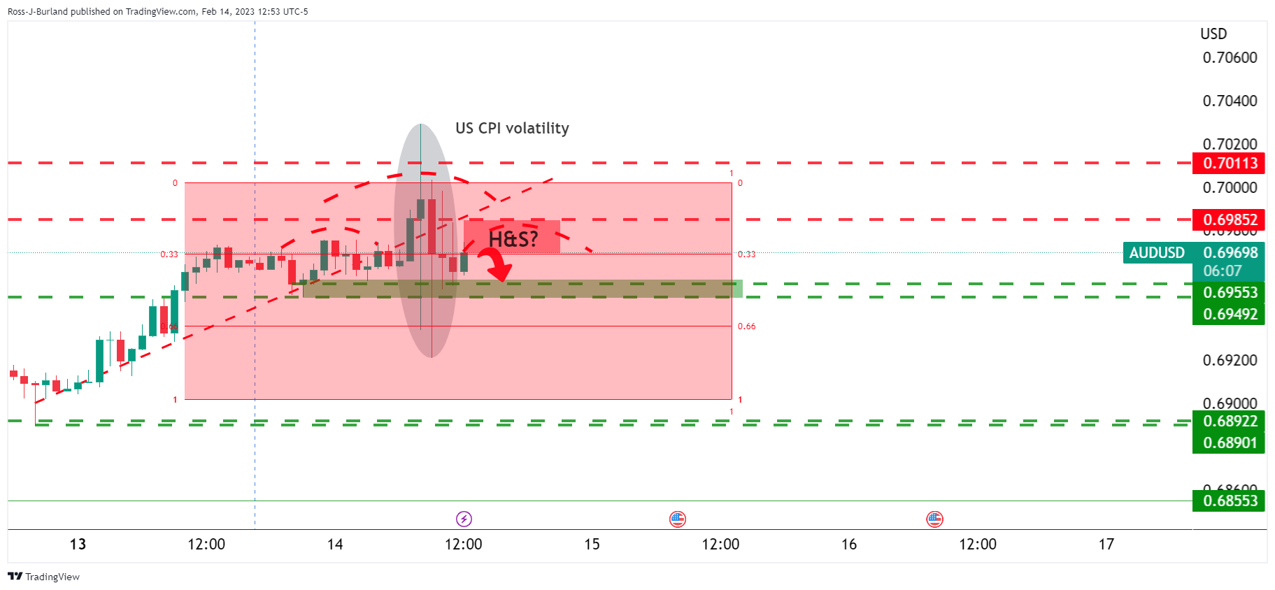 按照前期分析,澳元/美元价格分析:空头占主导,预期将跌破0.6900,继周二小时图确定跌破头肩形态后,澳元/美元处在疲弱当中: 分析指出,若澳元/美元跌破0.6950打开澳元/美元再次测试0.6