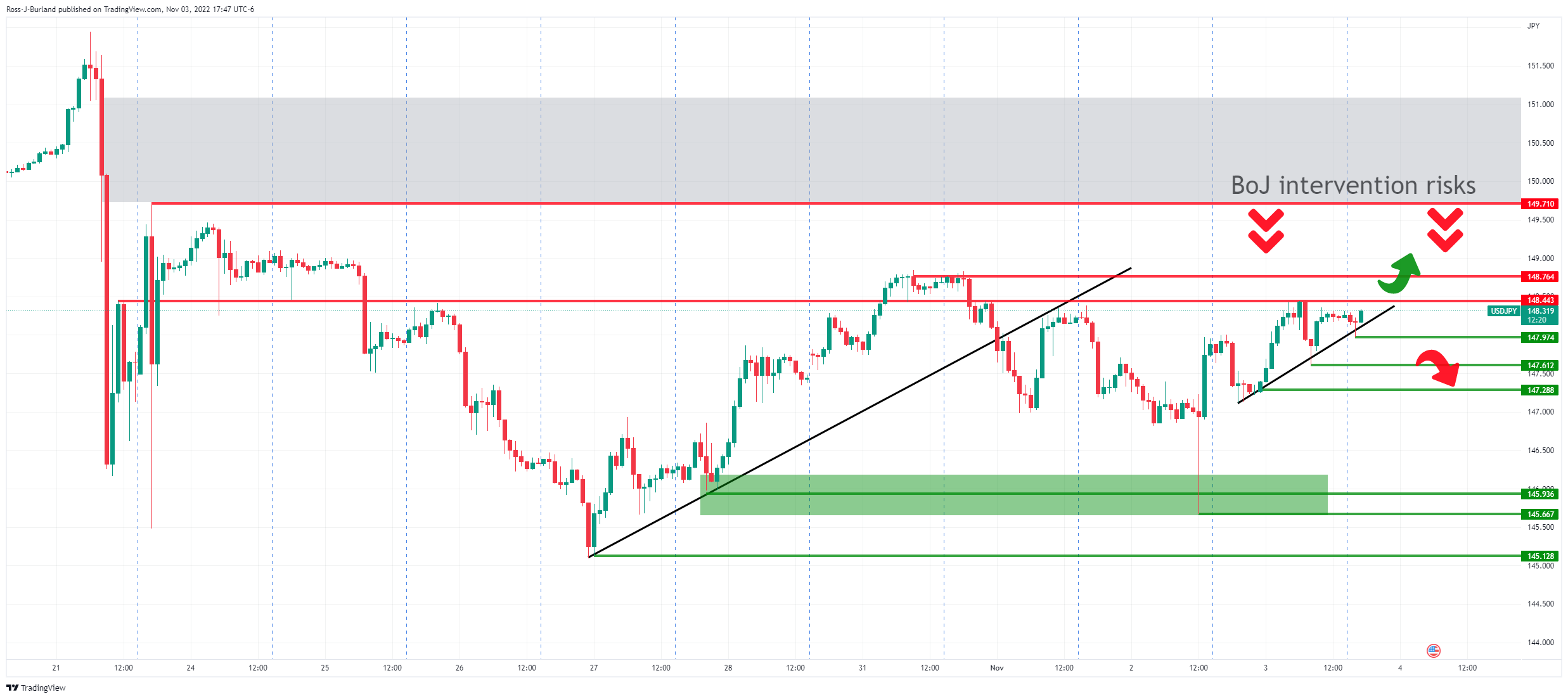 周五,美元/日元维持盘整于美国时段和伦敦时段高位附近,至今盘整于147.97和148.29区间。如下图所示,美元/日元处在小型趋势的前端,到目前为止,在美国时段重磅事件前,美元/日元仍未出现突破形态的