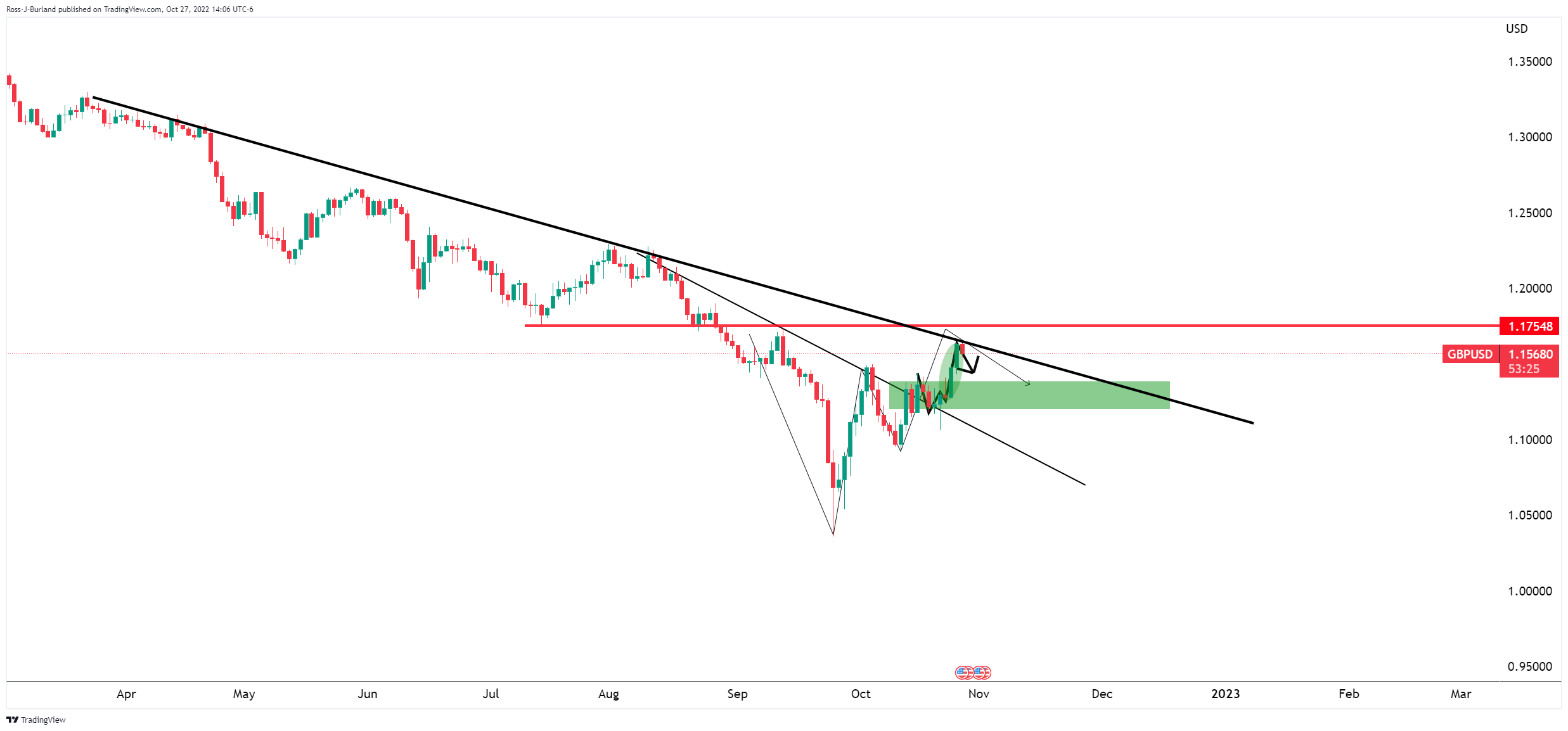 英镑总体趋势下方的多头仍未结清,但多头可能还没有认输。英镑/美元关键水平处在 1.1470,但抛售势头,尚未跌破 1.1550 的关键支撑结构。以下按照日图和小时图对技术形态进行分析。 英镑/美元日